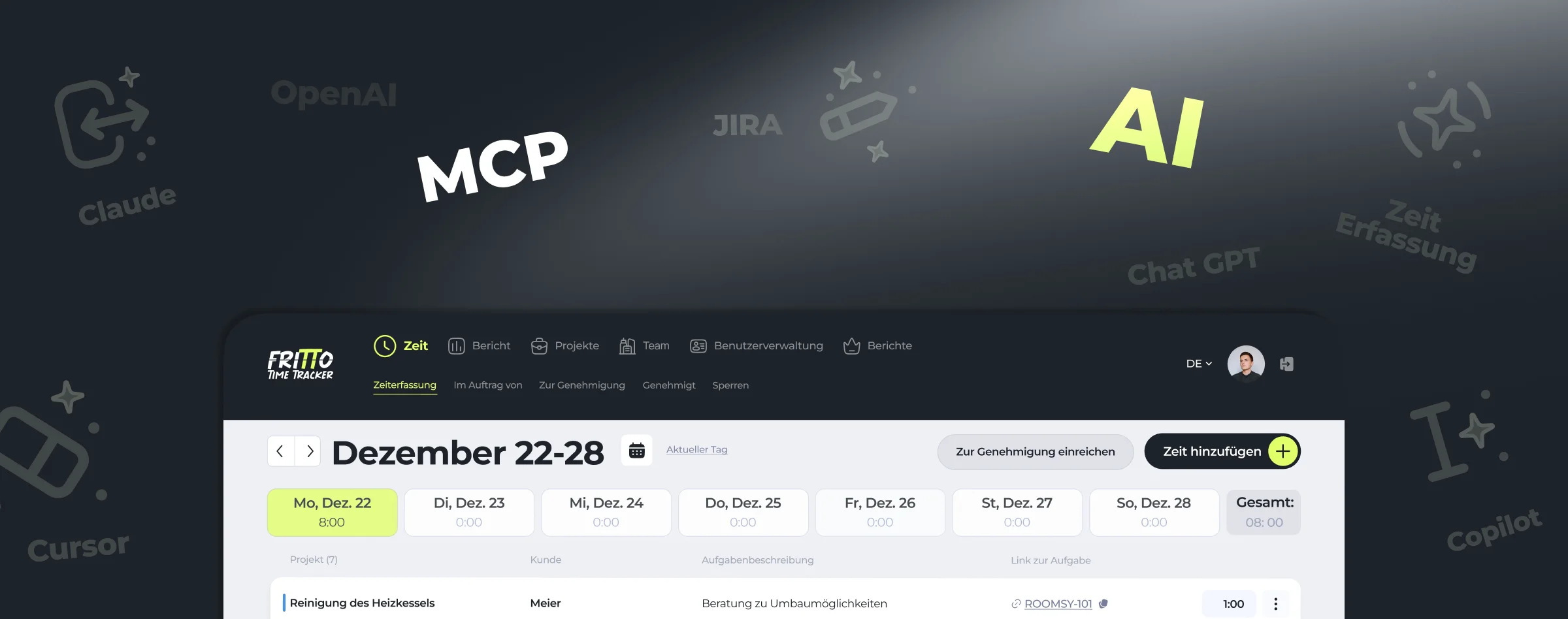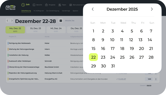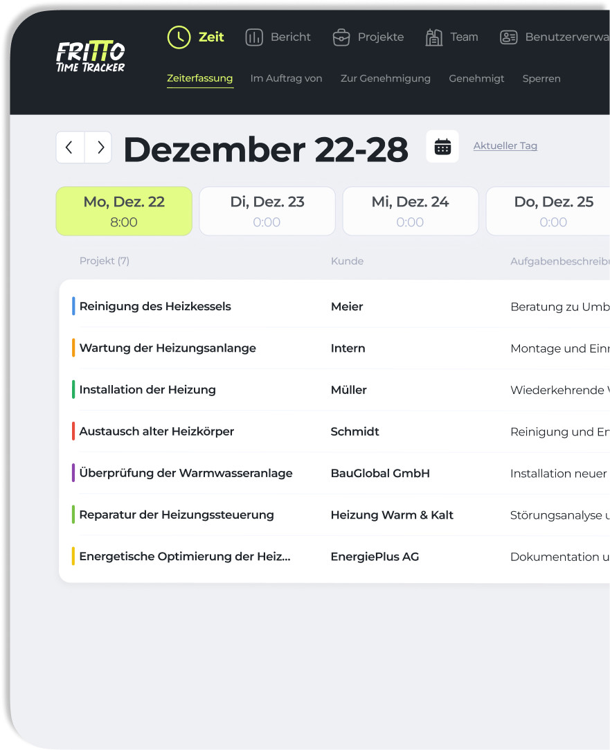 Fritto bietet Ihnen vielfältige Funktionen: Sie können Ihre Zeit für Tätigkeiten und Projekte erfassen, Zeiten im Auftrag anderer Nutzer buchen, Einträge zur Genehmigung einreichen und genehmigte Einträge einsehen. Außerdem lassen sich Zeiträume sperren, um nachträgliche Änderungen zu verhindern. So behalten Sie stets die volle Kontrolle über Ihre Zeit!