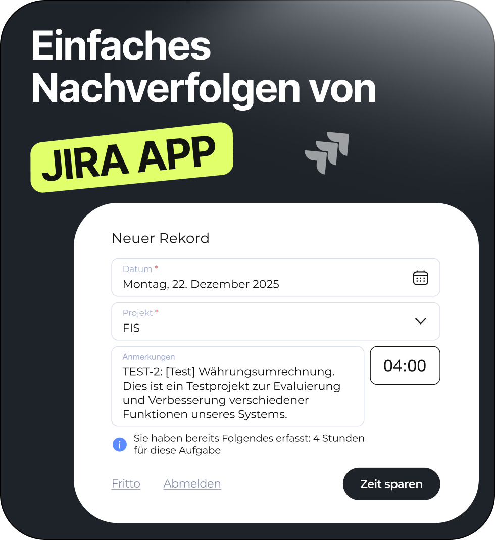 Automatische Aufgabenverknüpfung — Die erfasste Zeit wird automatisch der aktuellen Jira-Aufgabe zugeordnet.