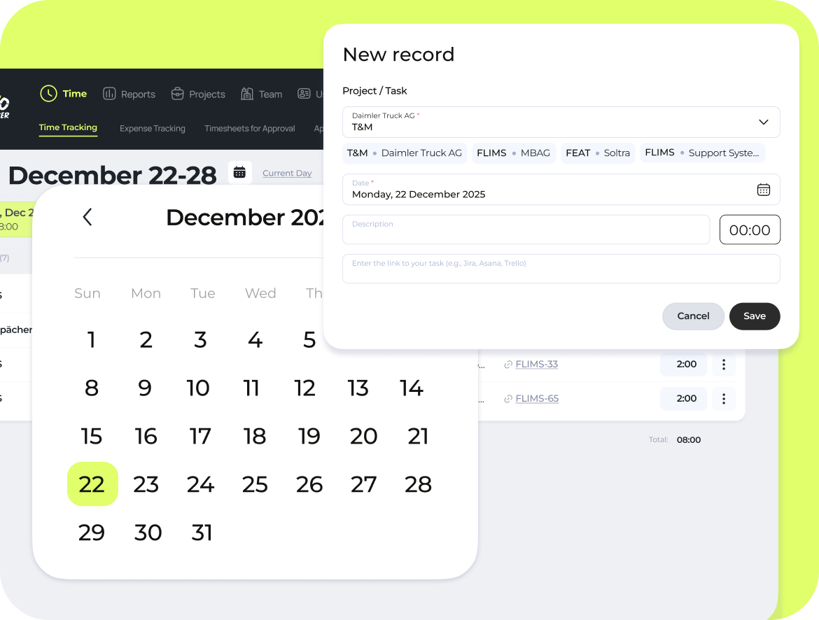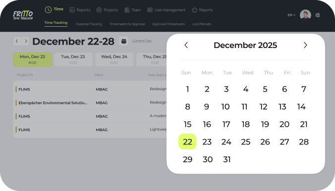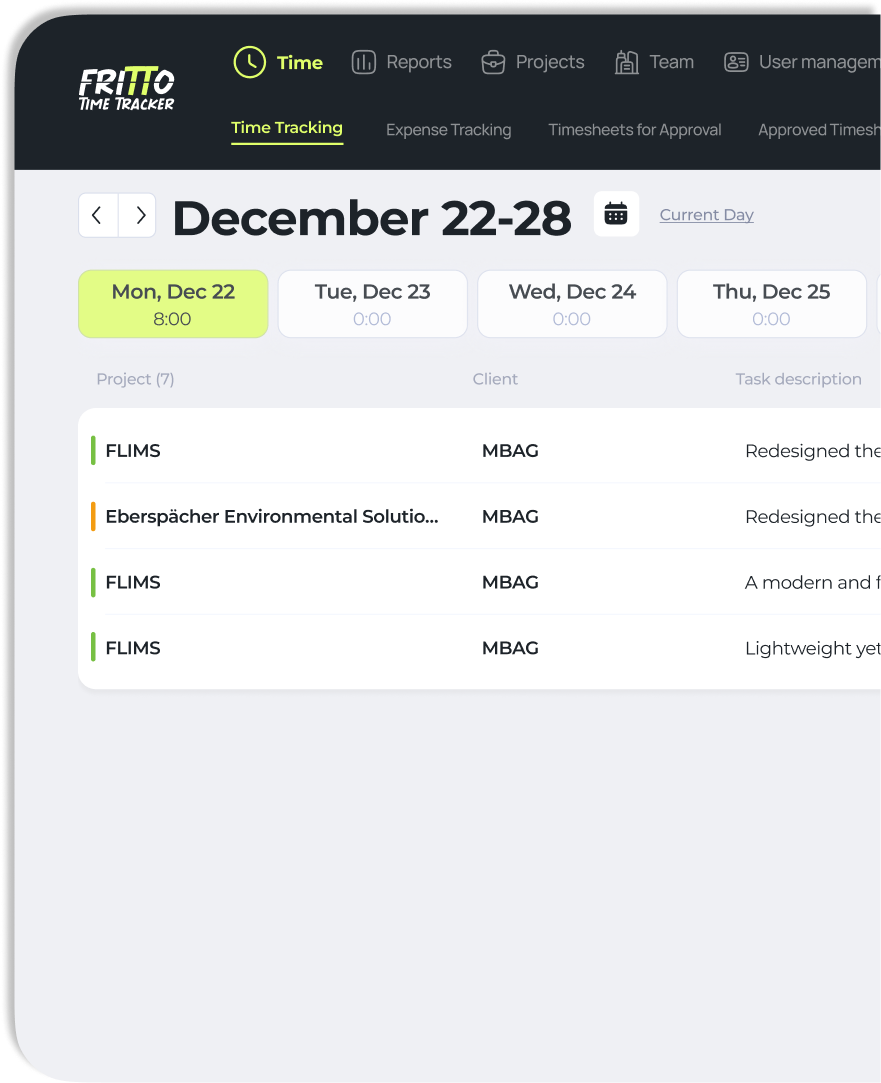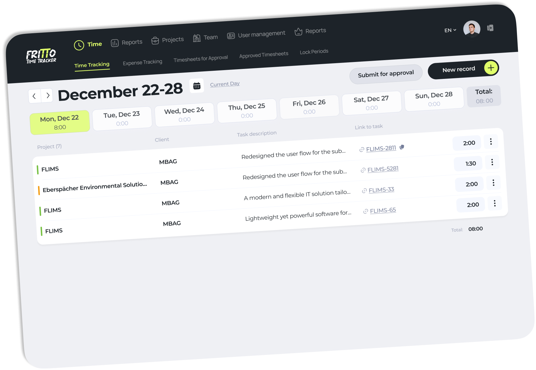 Fritto offers a wide range of features: you can track time for activities and projects, log time on behalf of other users, submit entries for approval, and review approved entries. You can also lock time periods to prevent retroactive changes — ensuring you always have full control over your time!